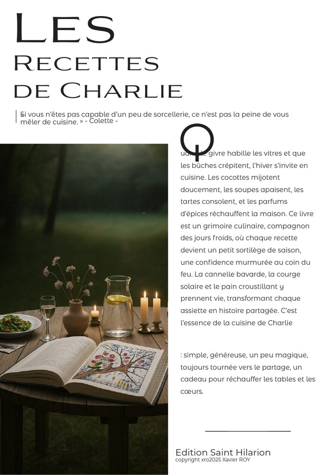 Qand le givre habille les vitres et que les bûches crépitent, l’hiver s’invite en cuisine. Les cocottes mijotent doucement, les soupes apaisent, les tartes consolent, et les parfums d’épices réchauffent la maison. Ce livre est un grimoire culinaire, compagnon des jours froids, où chaque recette devient un petit sortilège de saison, une confidence murmurée au coin du feu. La cannelle bavarde, la courge solaire et le pain croustillant y prennent vie, transformant chaque assiette en histoire partagée. C’est l’essence de la cuisine de Charlie : simple, généreuse, un peu magique, toujours tournée vers le partage, un cadeau pour réchauffer les tables et les cœurs.